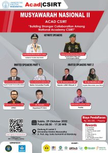 29 Oktober 2022 merupakan hari berserajarah bagi ACAD-CSIRT. Sudah 11 tahun organisasi ACAD-CSIRT akhirnya melaksanakan Munas yang ke-2. Munas ke-2 diadakan di Universitas Kristen Maranatha Bandung dengan jumlah peserta 300 orang yang terdiri dari 74 perguruan tinggi di seluruh Indonesia. Tema Munas ke-2 kali ini adalah “Building National Academy- CSIRT in the Challenging Times”.